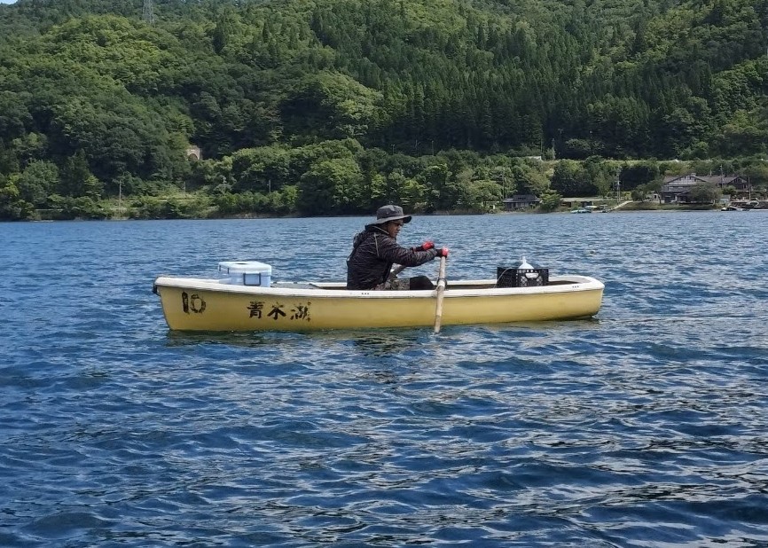 久しぶりのサンプリングで、長野県の青木湖に行ってきた。まだ調査ができていないエリアでありながら、それなりの水深があり、しかも比較的近くて小さくて調査しやすい、ということで優先順位的には常に上位にあったのだけど、なかなか時間が無くてやっとの訪問になった。てっきり火山系の湖(堰止湖とか)だと思っていたけど、調べてみると構造湖に分類されるらしい。大きな流入河川は無く、湧水が水源になっている湖で、水位の変動が大きいとのことで、調査日は減水気味でボートへの乗り込みが少し大変だった。青木湖では西湖と同様に動力船が禁止されていて、西湖以来の手漕ぎボートでの採水。西湖と同様、沖合に固定ブイが浮かんでいるので、そこにボートを括り付けて固定して作業する。