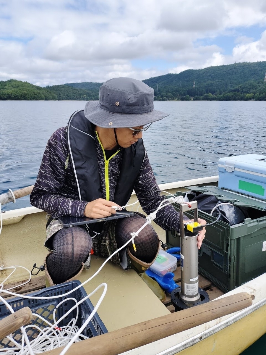 調査日は風が心配されたけど、予報ほどは吹かなくて予定通りに出ることができた。霧島御池と同じく、学生と共同研究者の3名体制で、船が小さいので2隻で出船。15分くらい船を漕いで湖心に浮かんでいる複数のブイから、一番深そうな場所にあるものを選んで、2隻を連結して調査開始。まずはCTDを降ろしてみたところ、56mで着底。ほぼ最深部で調査ができていることを確認し、船上でタブレットに接続して環境プロファイルを確認する。温度躍層とクロロフィルピークが明瞭に見られ、溶存酸素はダラダラと湖底にかけて下がりながらも嫌気にはならない、という感じで予想通り。透明度がとても高く貧栄養であることが予想されたので、採水深度は表層と深層の2水深に絞って、その代わりに採水量を増やすという作戦に決めた。