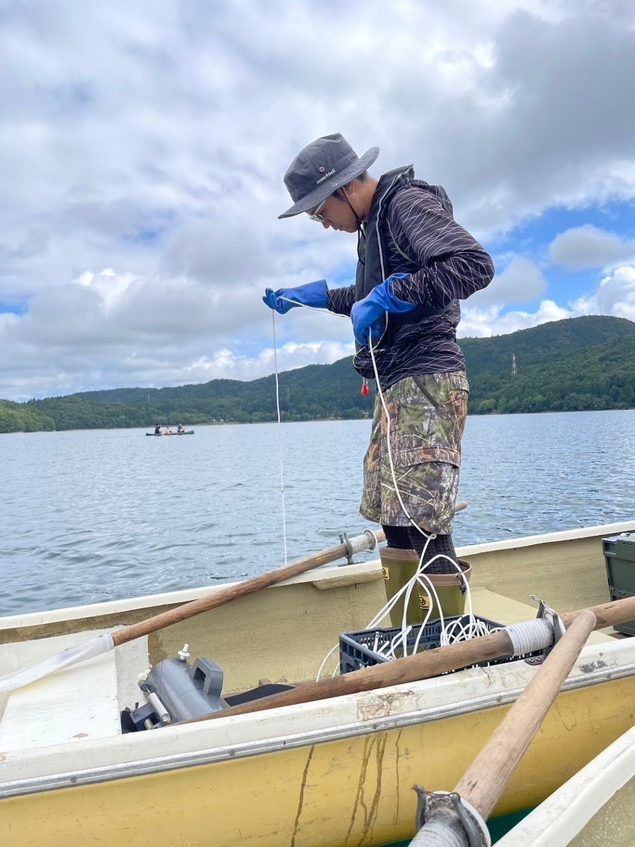あとはひたすら採水器をロープで降ろして引き上げて、横で待機しているメンバーに水を容器にくみ取ってもらう、というのを繰り返して、全部で40Lほど採水。前回の霧島御池の際、90mのロープ採水でも意外と楽に感じたので、今回も楽かなと思っていたけど、意外としんどくて、40mの引き上げの最後は腕や腰に結構来ていた。おそらく、ボートが小さくて足場が安定しないことが大きくて、逆に然別湖で氷の上で調査した時は約100mのロープ採水でも本当に楽だったので、足場の安定性が引き上げのしんどさに結構影響するのだなということが理解できた。