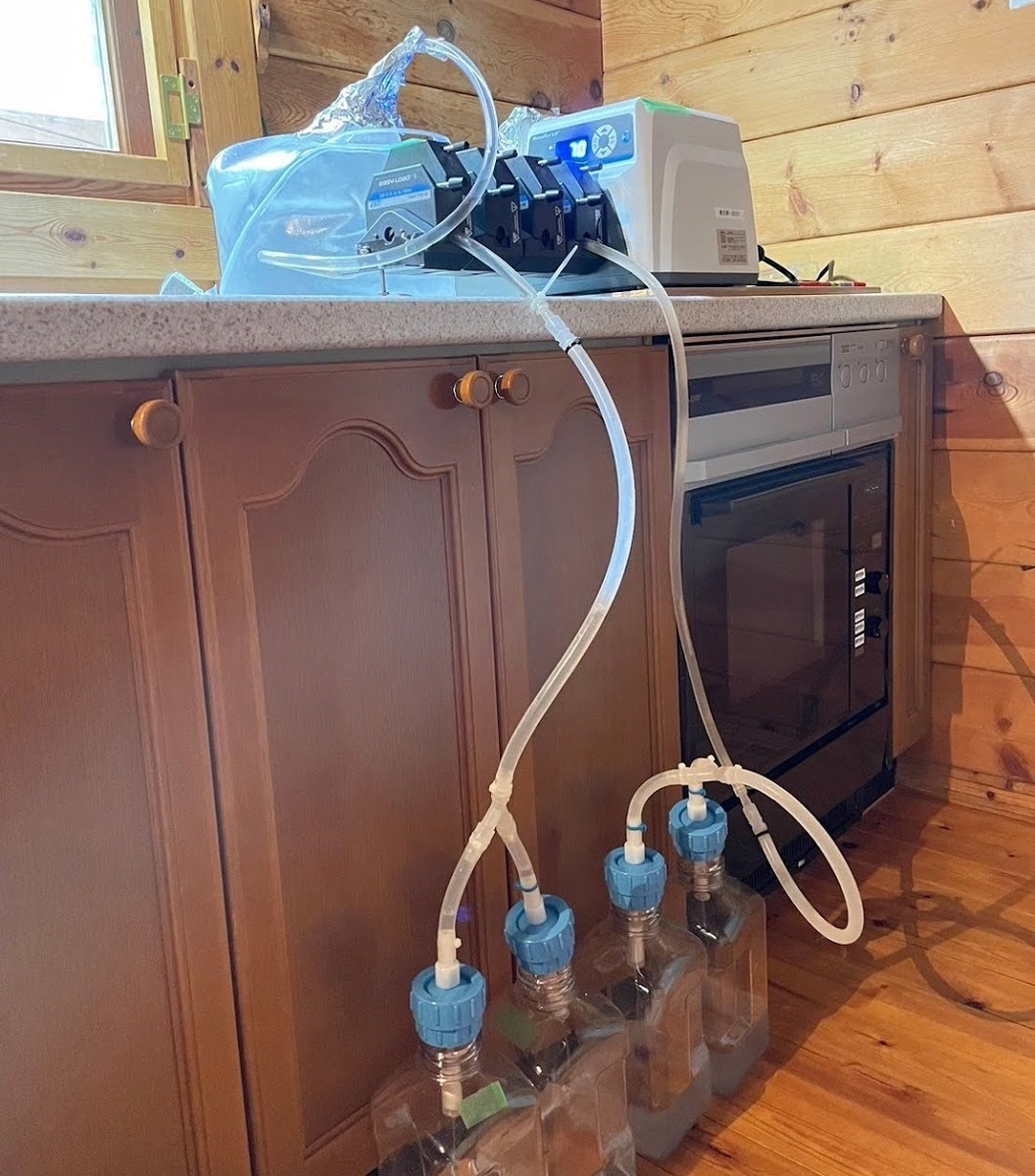 今回は採水深度が少ない代わりに濾過量が多かったので、流路を2分岐させて短時間で大量濾過する方法をとった。予想していた通り、貧栄養湖で生物量が少なく、いつもよりも多くの水を濾過する必要があったので、たくさん水をとっておいて良かったし、2分岐システムの活躍で早い時間に濾過を終わらせることができた。おかげで明るい時間には全て切り上げることができて、前回と同様に、調査当日に夕食と温泉を楽しむ時間まで確保できた。一人で深夜までろ過していた時代には考えられないことだけど、調査の効率化が進んで、素晴らしいことにこれが定番になりつつある。今回は忙しい日程にねじ込む形でかなり短期間で一気に企画したので、久しぶりの調査で何か忘れていないかドキドキしたけど、全て計画通りに終わってほっとした。むしろ、前回以上に効率的で楽に作業が終わって、自信になる調査だった。